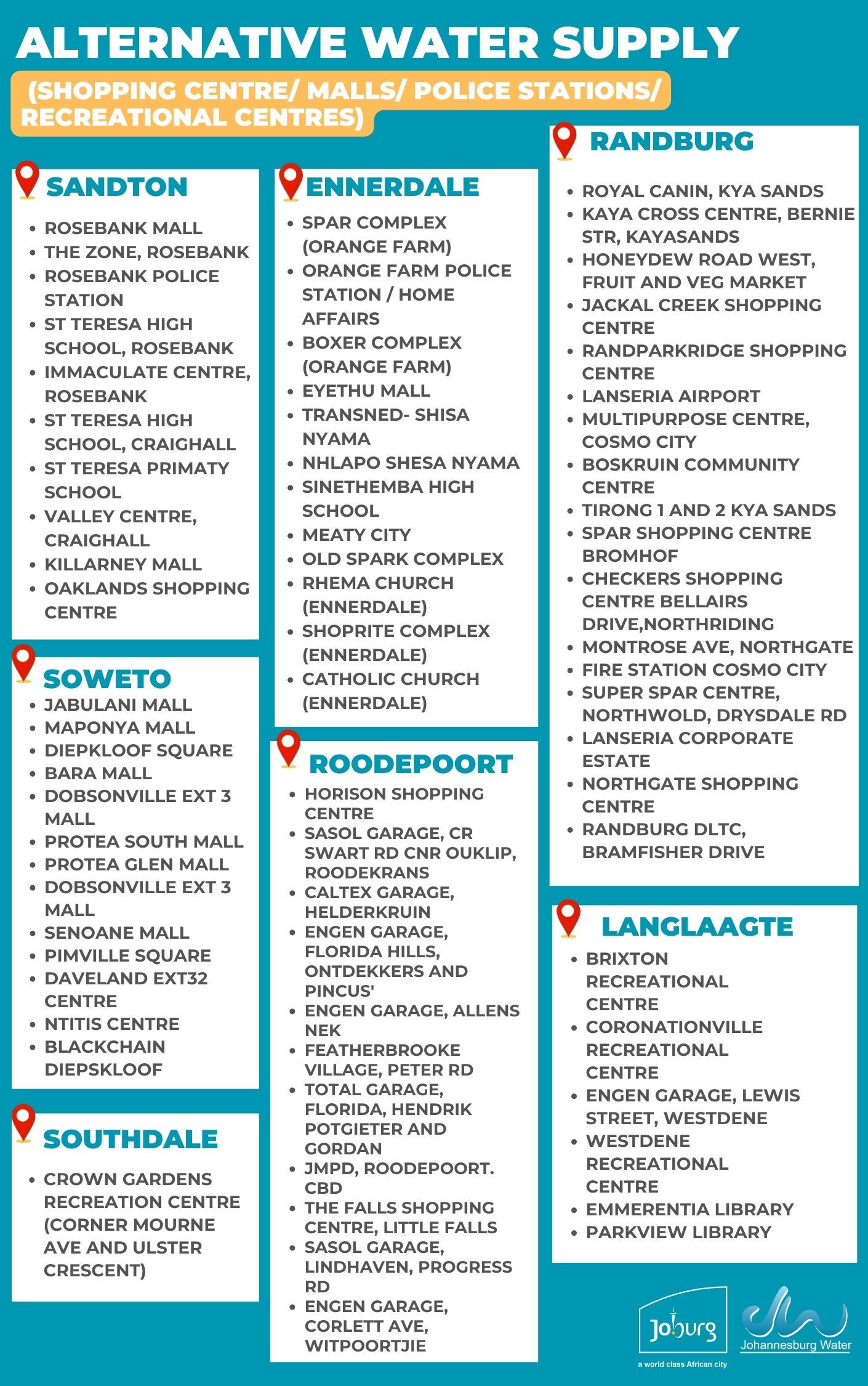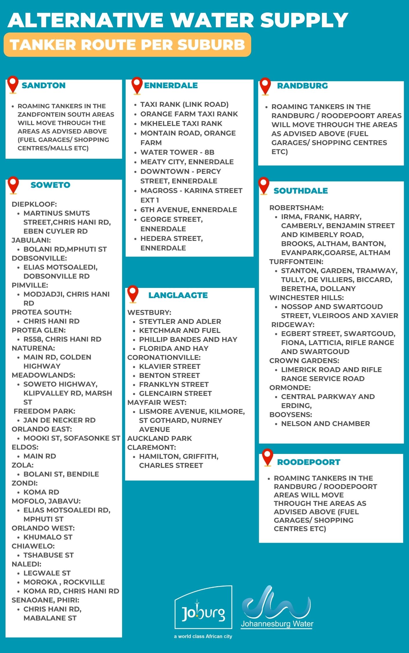 Most suburbs have started getting water supply. Cosmo City, Ferndale, Fontainebleau, Randburg and Kensington B, Little Falls, Strubens Valley, Allen’s Nek, Wilro Park, as well as the Northgate and Sundowner areas are being closely monitored as residents are still struggling with water supply. Water tankers continue to be deployed to service these areas.