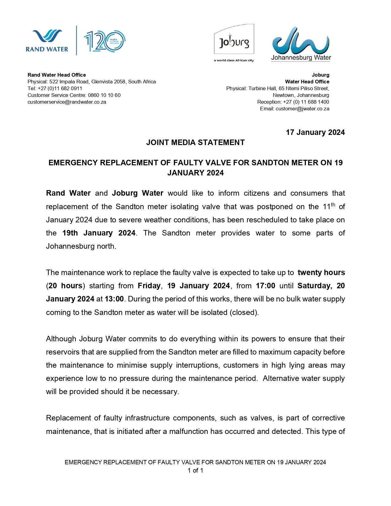 Joint Media Statement between RW and Johannesburg Water – re-scheduled maintenance of the Sandton meter on 19 January 2024