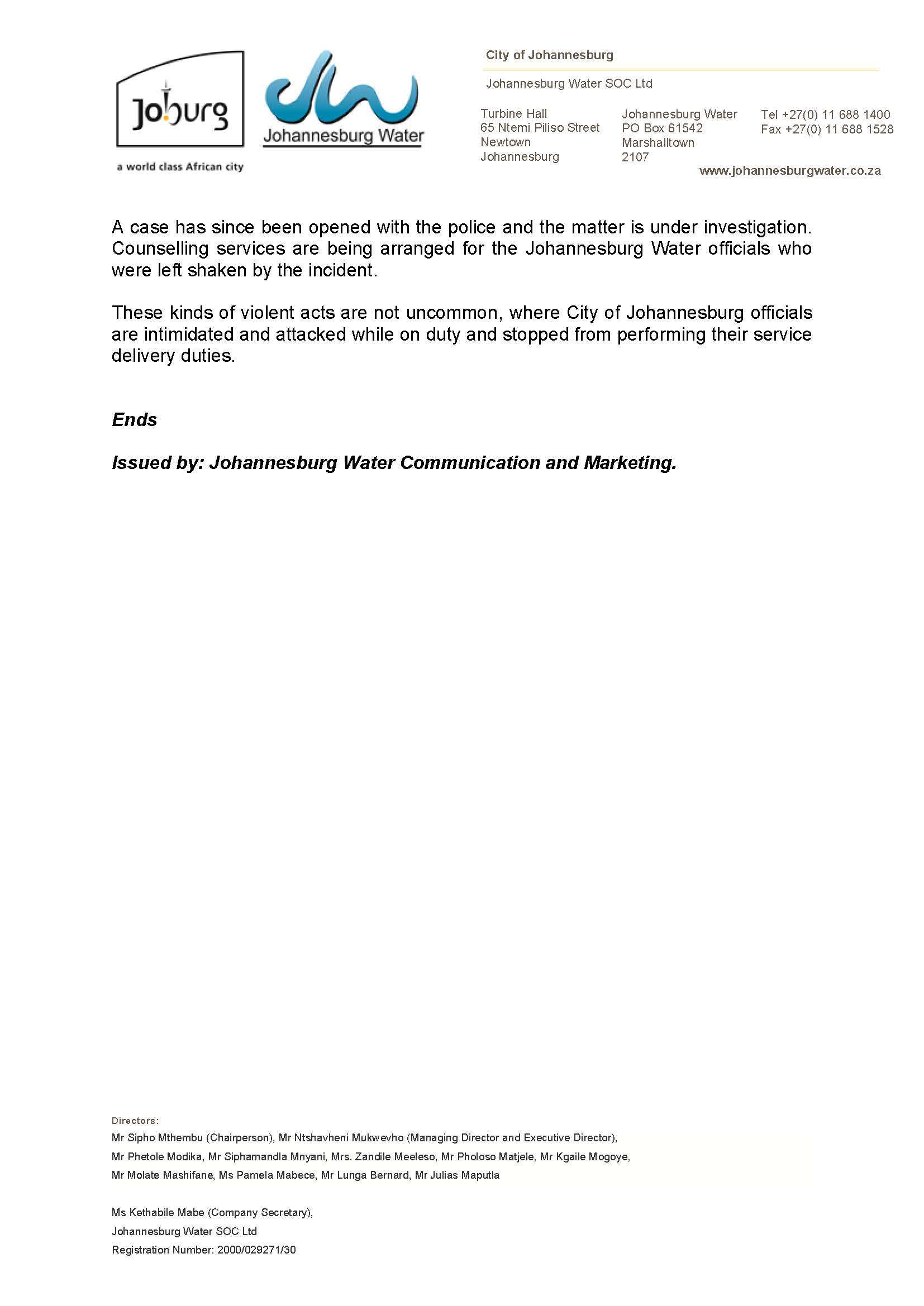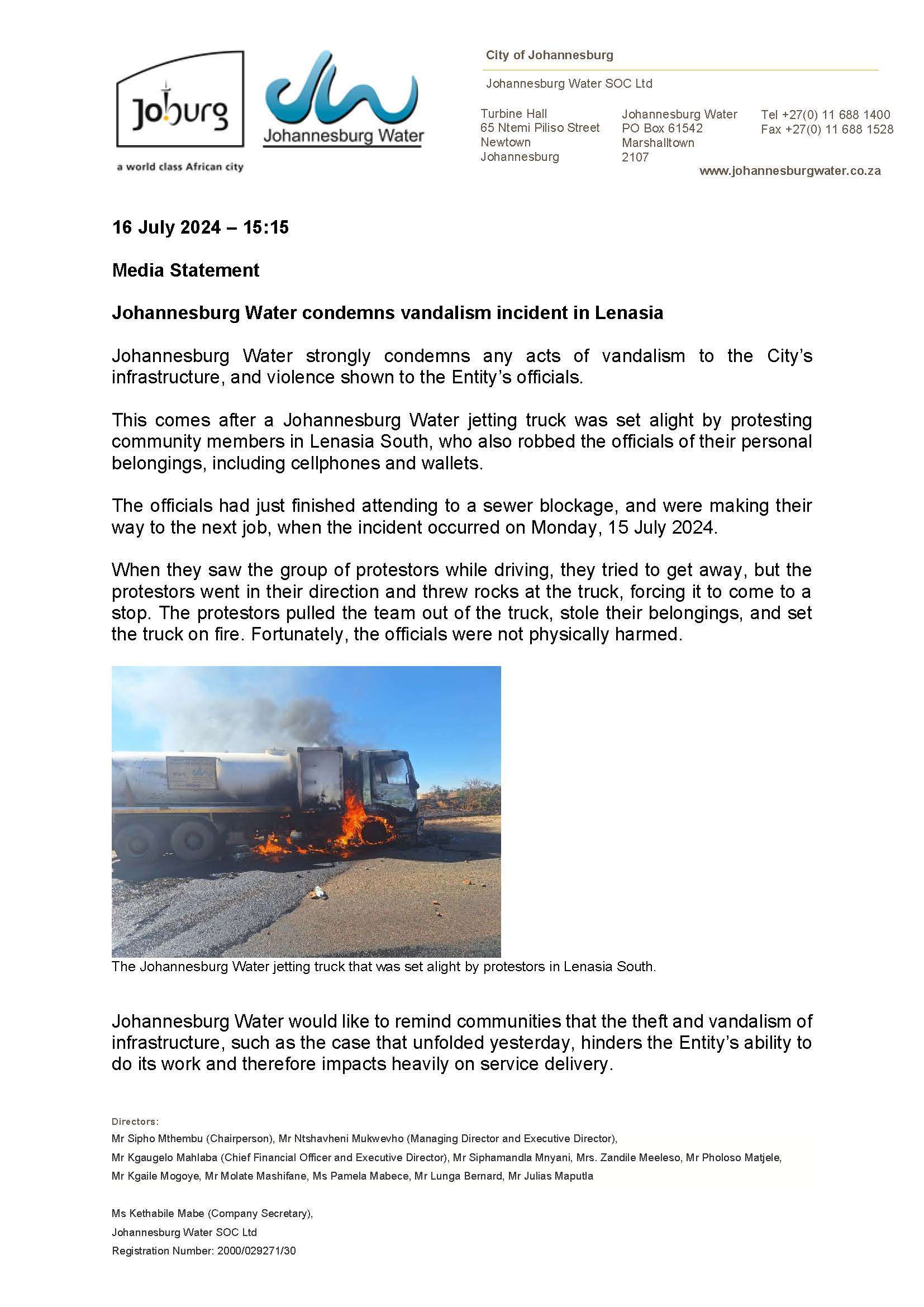 Johannesburg Water condemns vandalism incident...