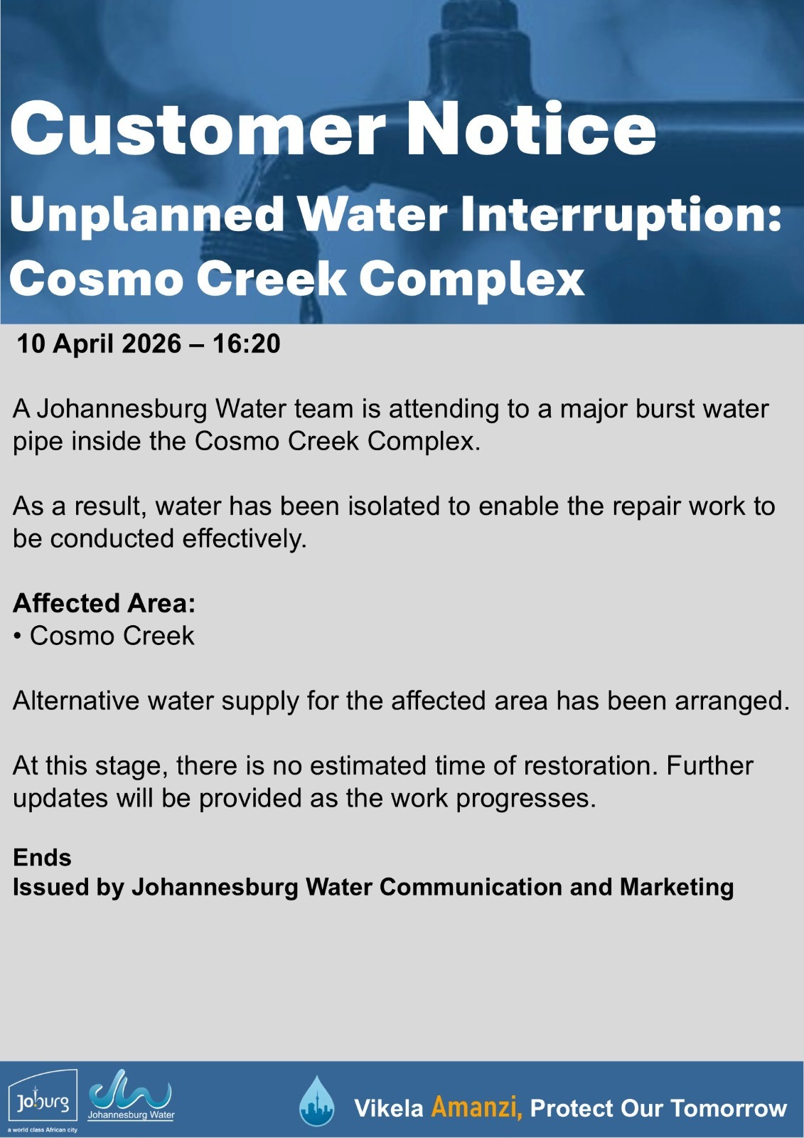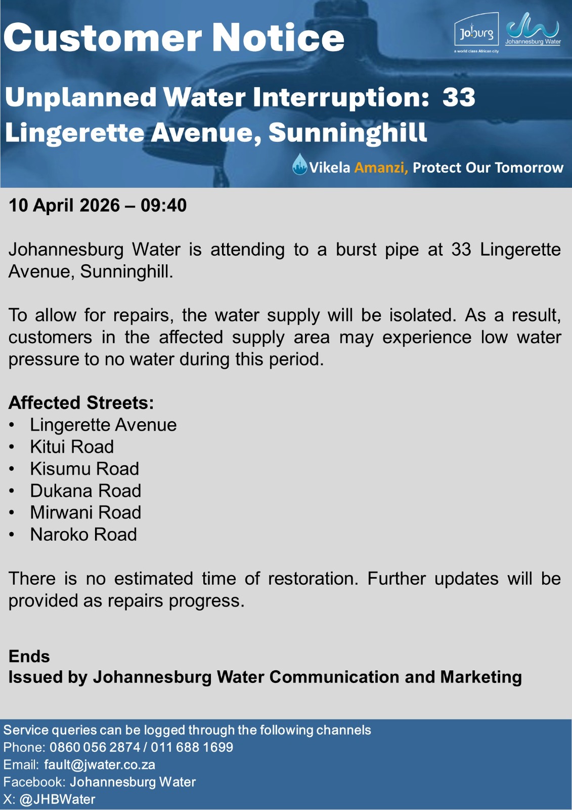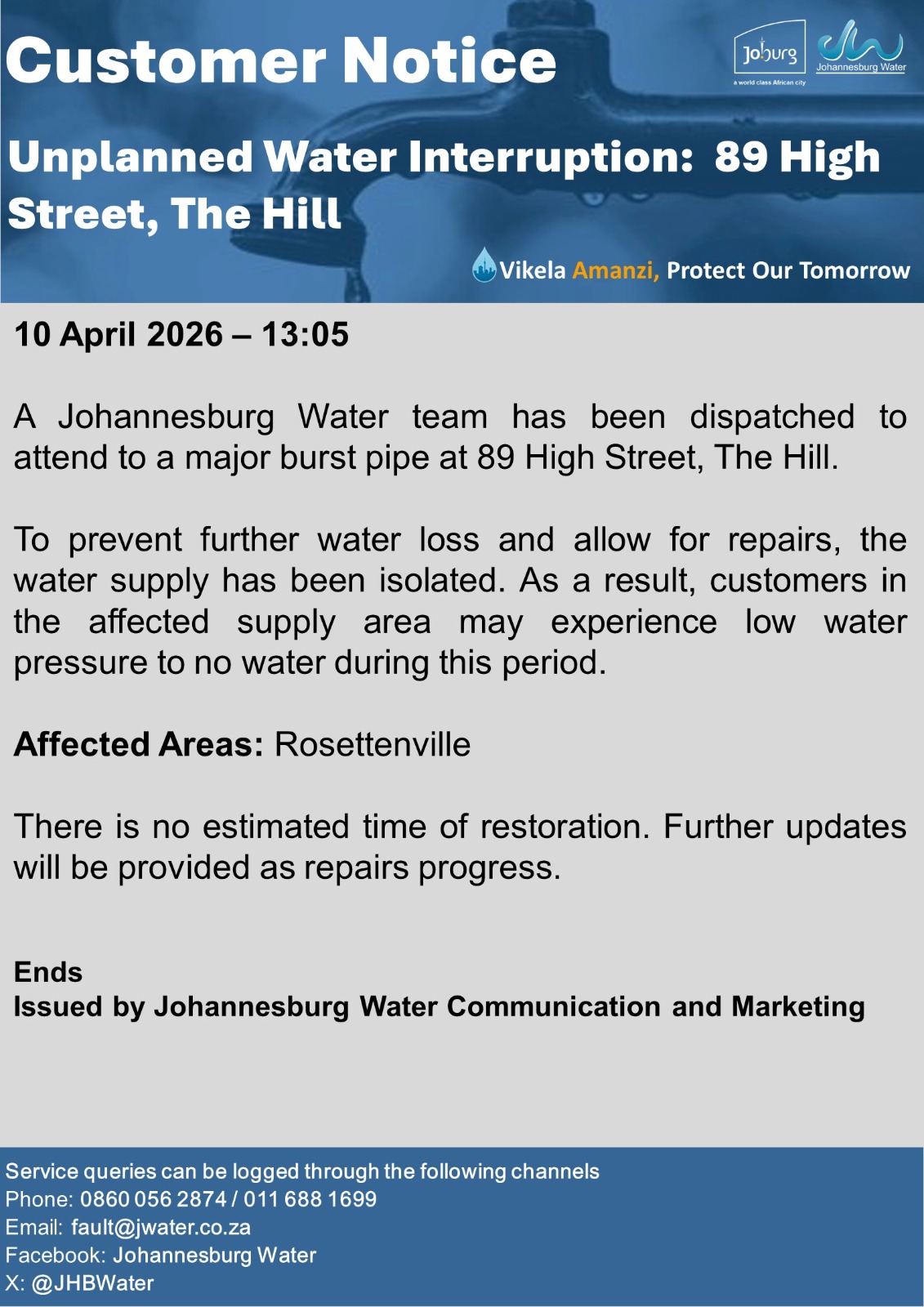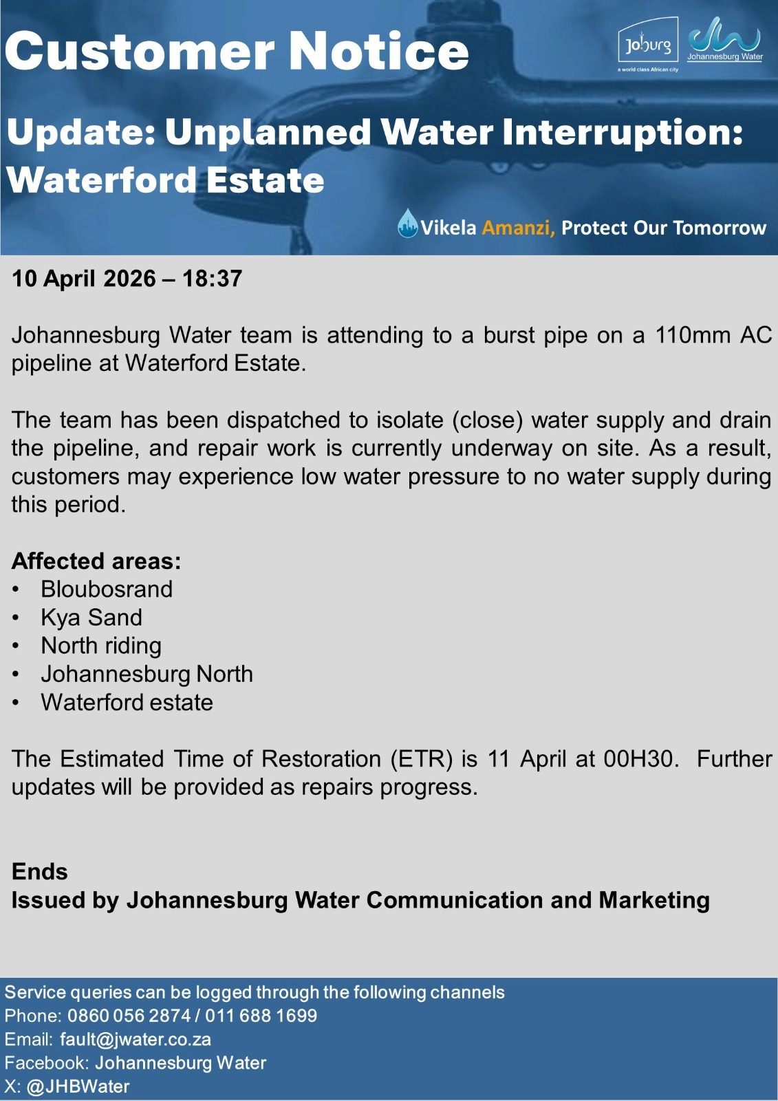Please use the fault@jwater.co.za for logging water related incidents only