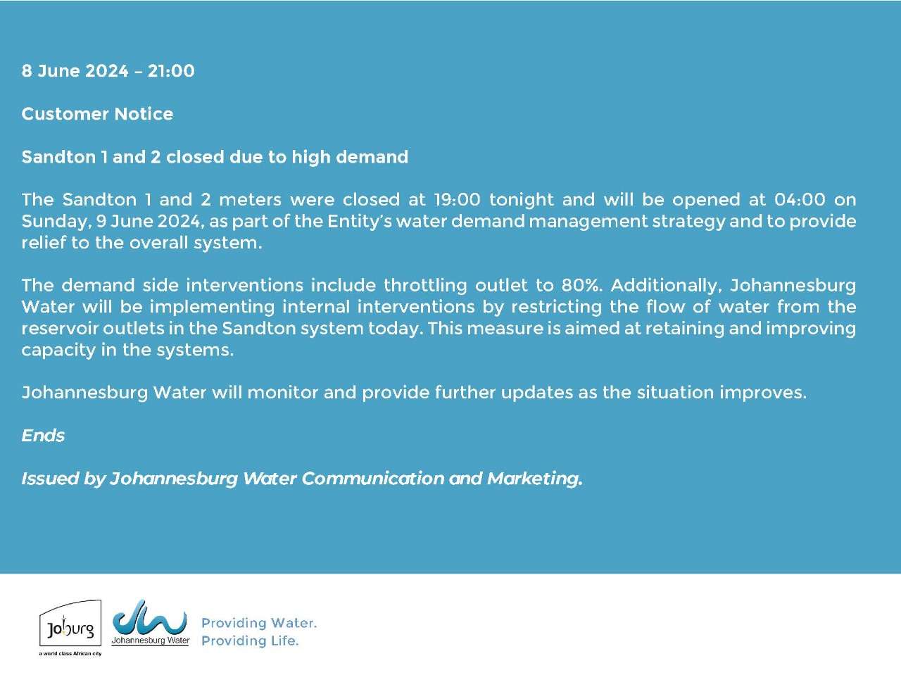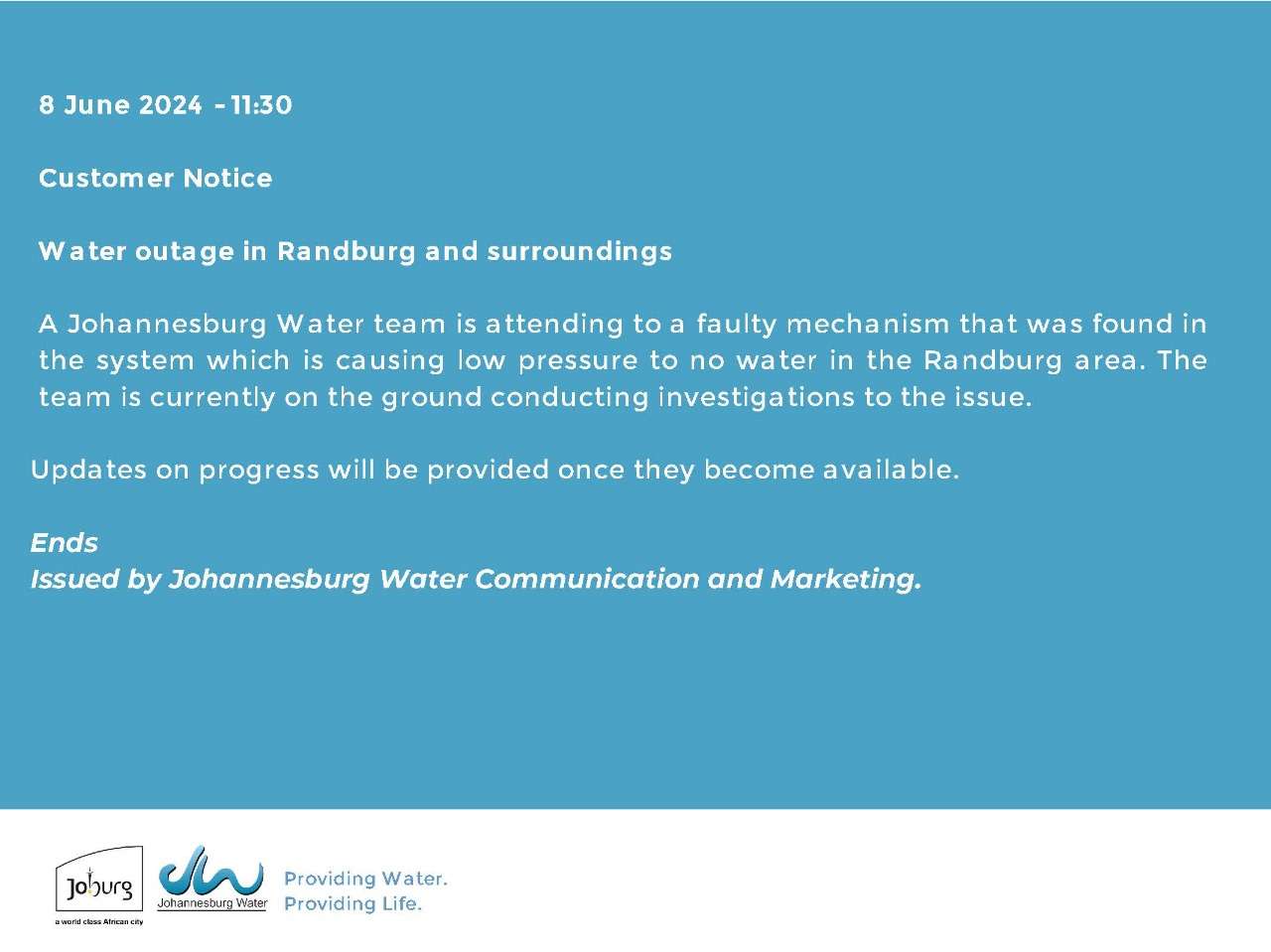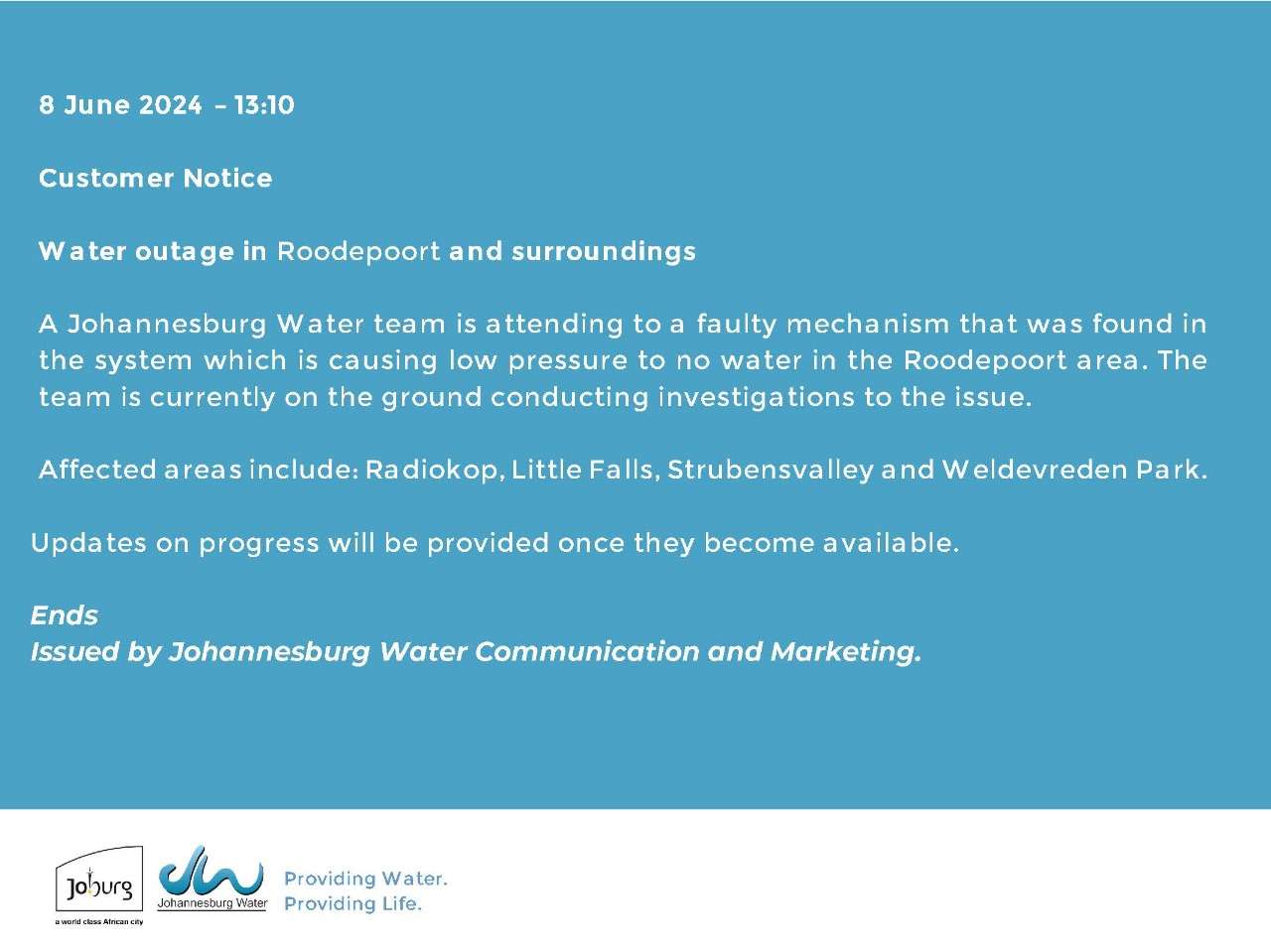 Johannesburg Water is monitoring the situation and providing relief and alternate water where required. Water tanking will be expanded to areas being reported as affected.
