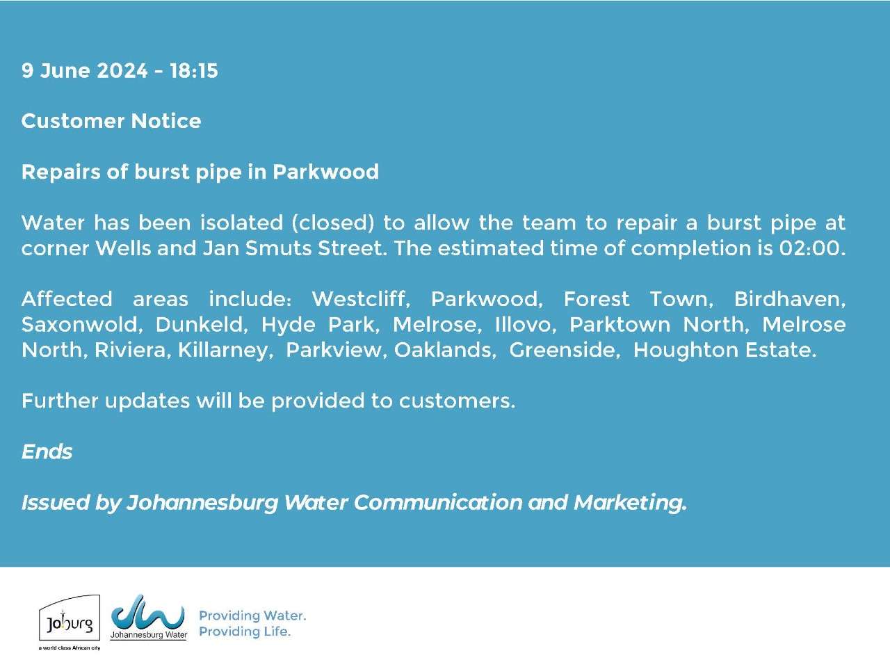 Johannesburg Water apologies for the inconvenience caused and will provide updates to customers.