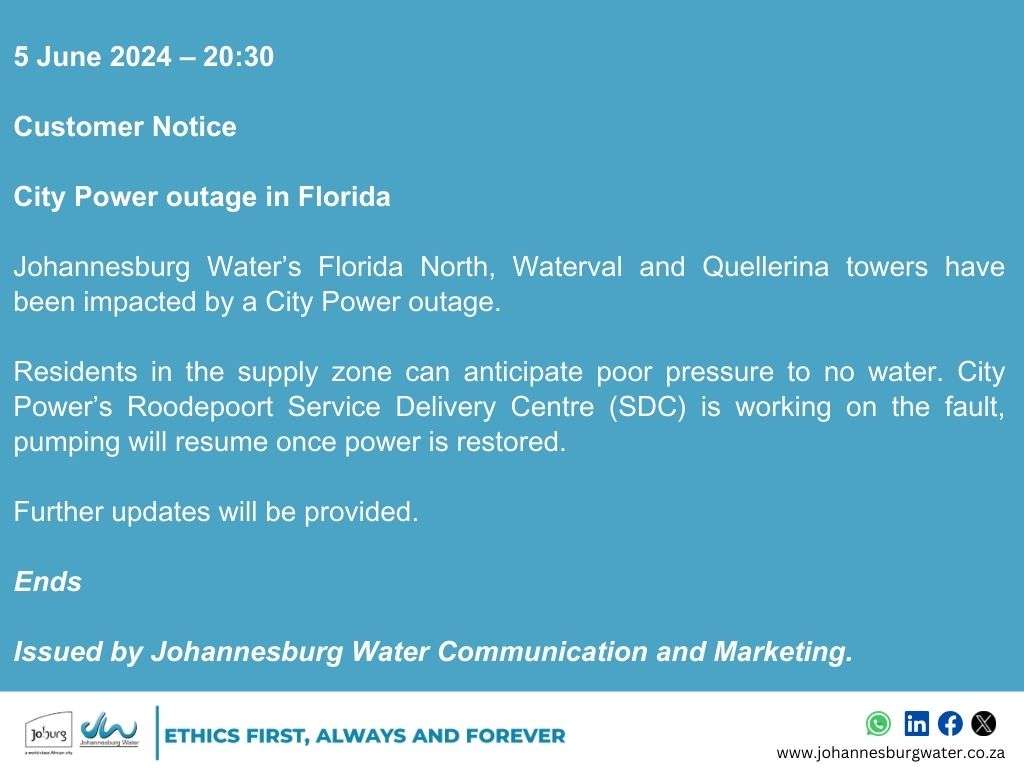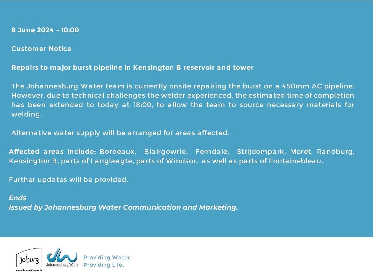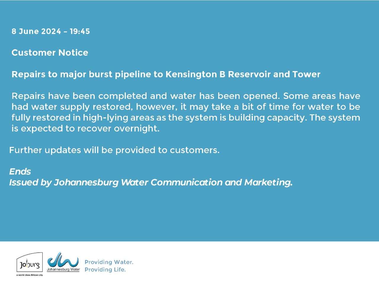 Water supply will be restored as soon repairs are completed, and systems will gradually recover. Johannesburg Water will monitor and provide updates once they become available.