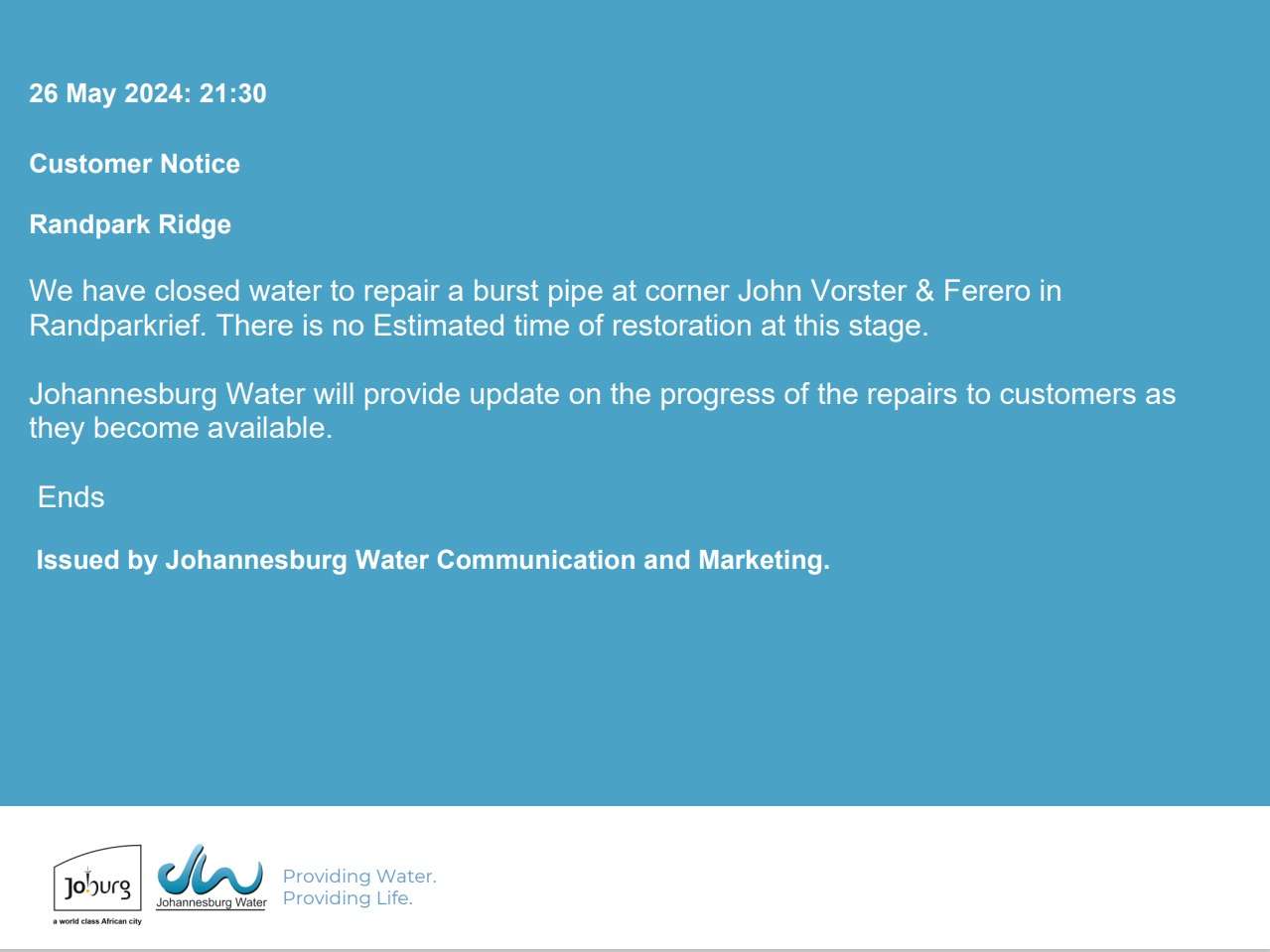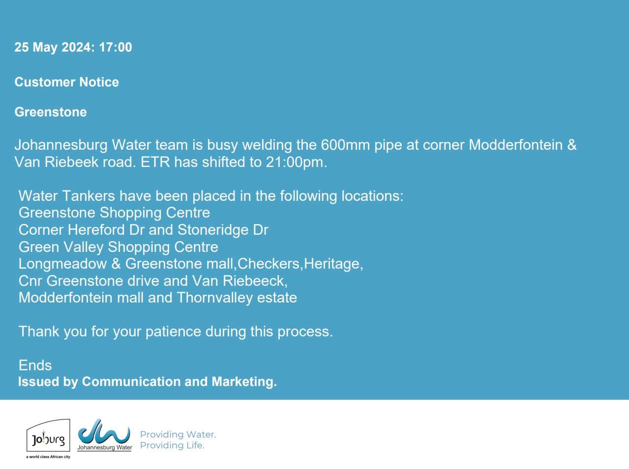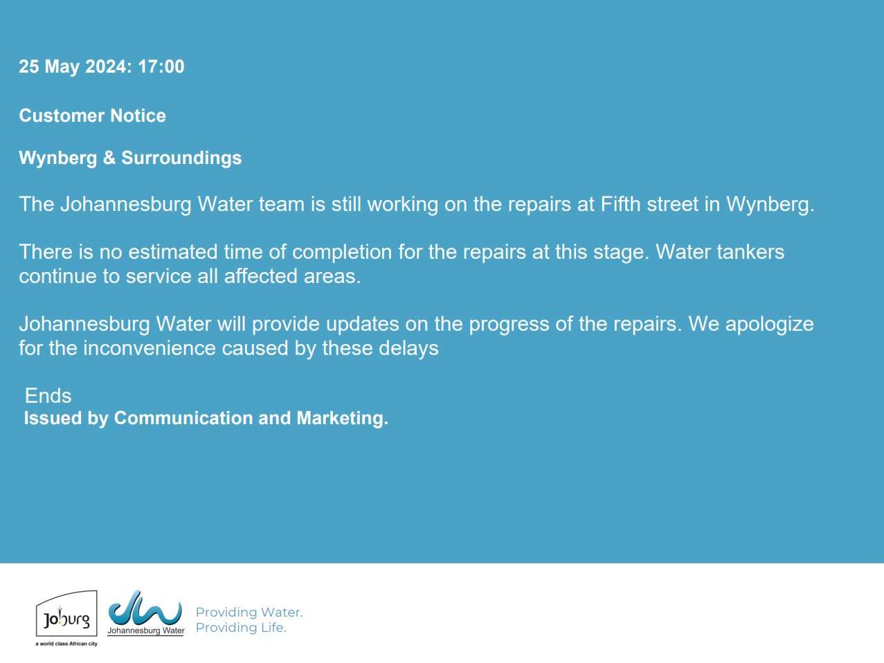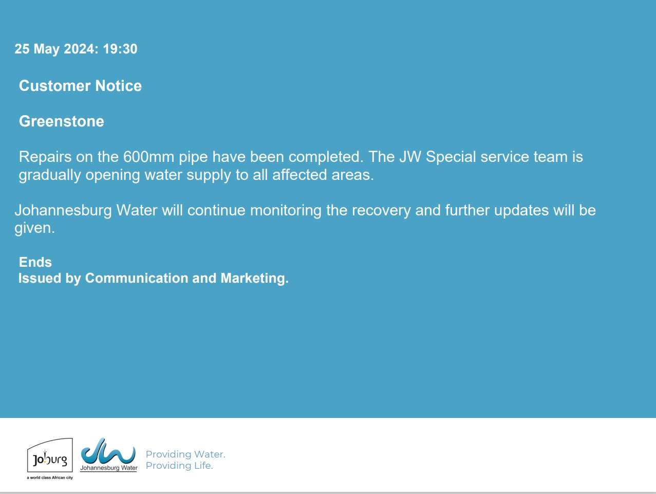 Due to the prolonged outage, the water supply has not been fully restored. Water tankers continue to provide alternative supply Johannesburg Water will monitor and provide update to customers as they become available.