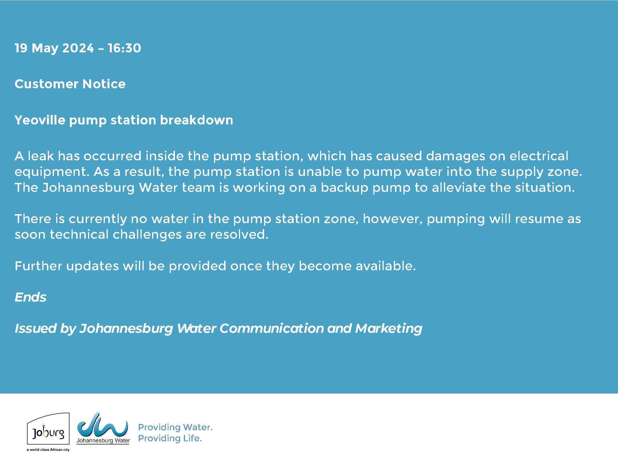 Issued by Johannesburg Water Communication and Marketing.