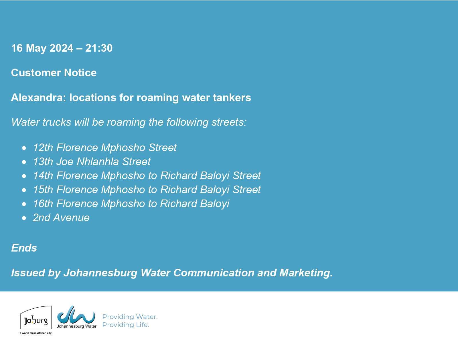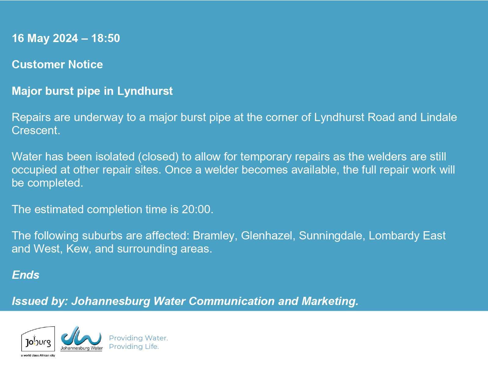 Additionally, Johannesburg Water is undertaking complex repairs at the reservoir, there is no estimated time of restoration at this stage.