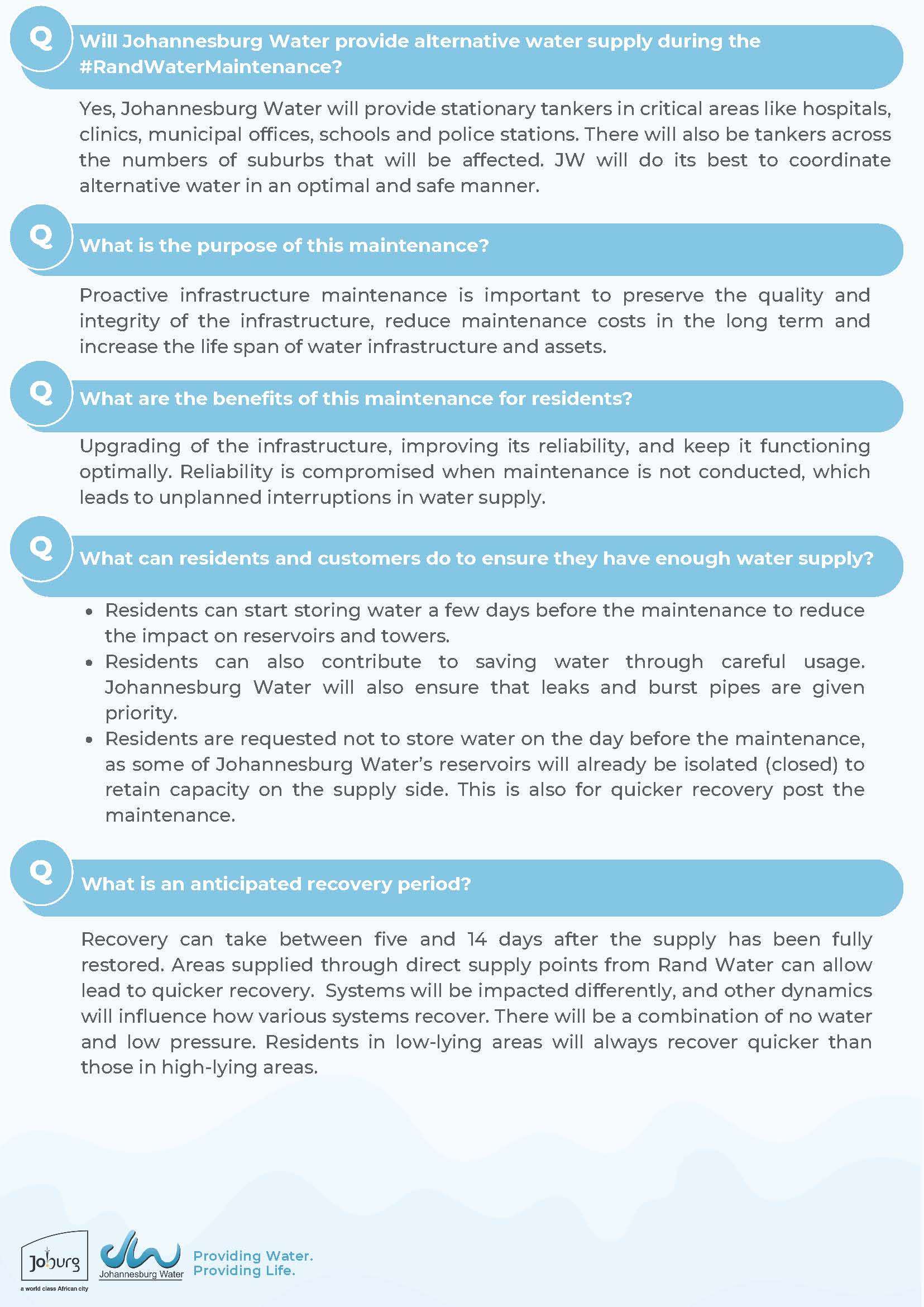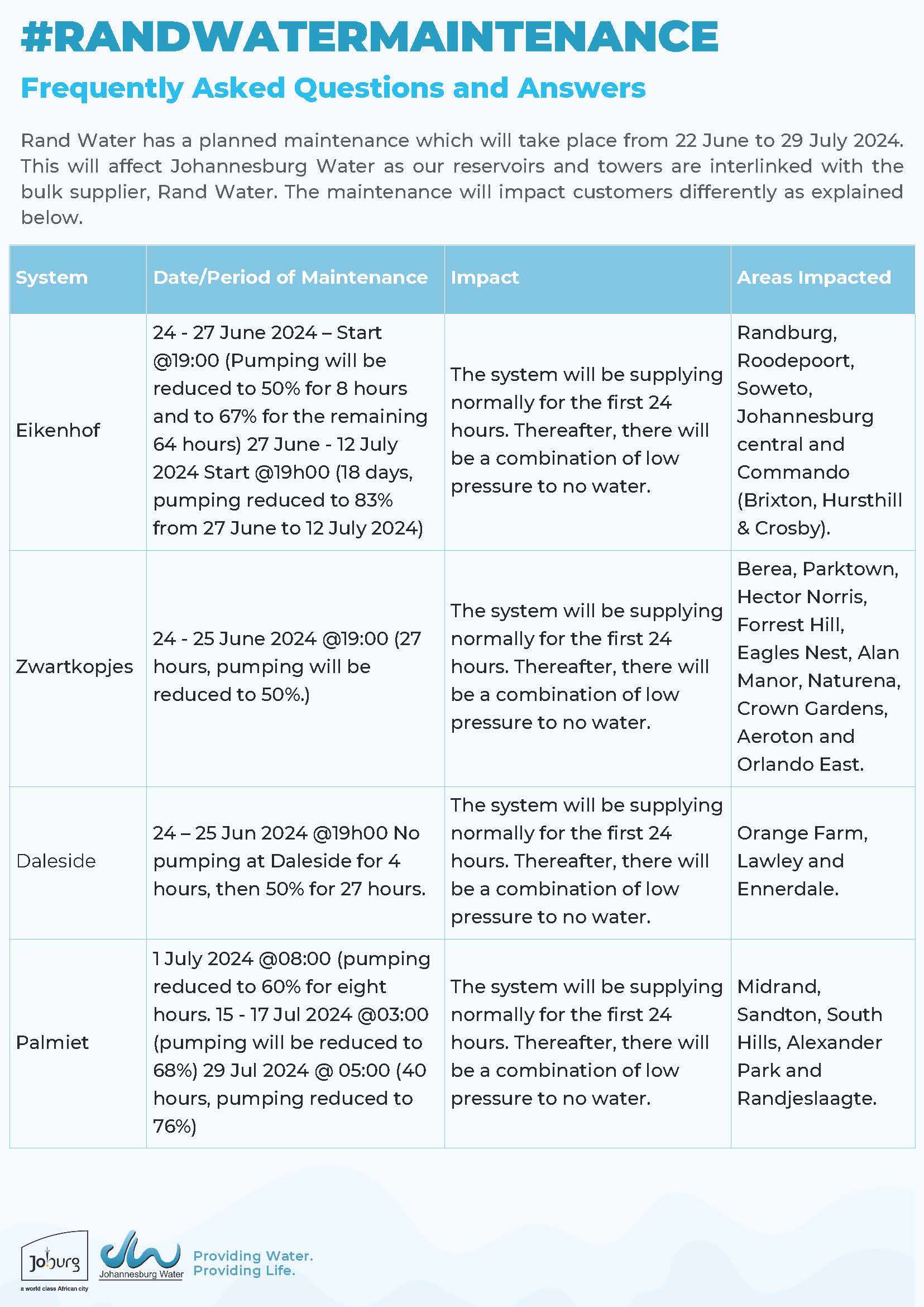 Johannesburg Water customers will be impacted by a planned Rand Water maintenance to take place from Saturday, 22 June until Monday, 29 July 2024.